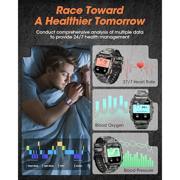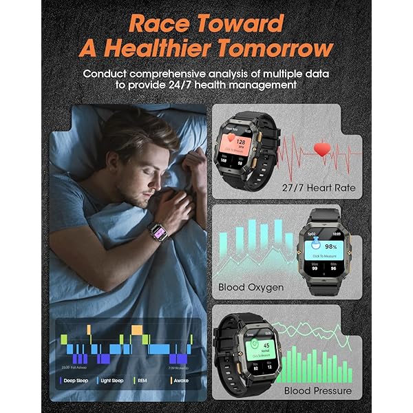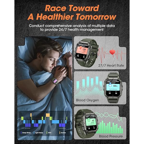 GUARD YOUR HEALTH- The watches for men monitors heart rate, blood oxygen and blood pressure in real time with high-precision sensors. This rugged fitness watches for men also monitors sleep, such as deep sleep, light sleep and REM, and provides sleep trends for the last seven days, analyzing your health in real time and helping you adjust to a healthy lifestyle.(Note: The health data can only be used as a reference for exercise and cannot be compared with professional medical equipment data).